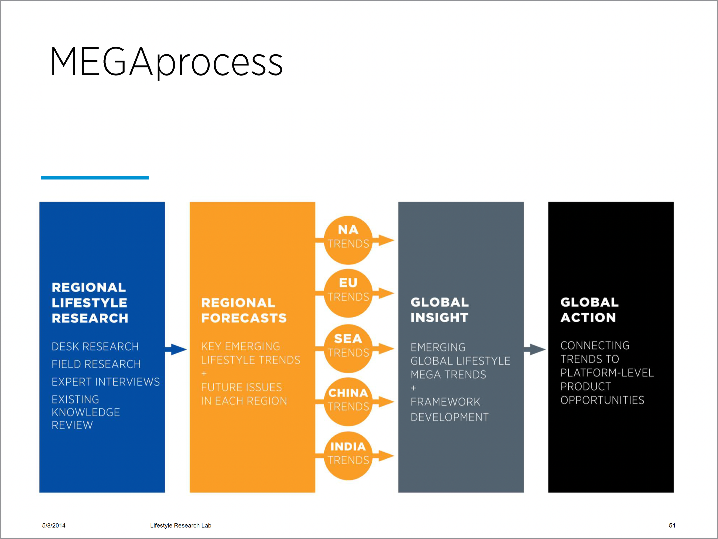 Sample subjects: The Changing Family, The Home of the Future, Asian Food Cultures, What’s for Breakfast?, The Future Kitchen, Health @ Home.Ongoing trend research to anticipate new behaviors, attitudes, and needs. Areas of focus: Socio-Cultural Shifts, Home Design, Travel and Hospitality, Cooking and Food Culture, Health / Wellness / Fitness, Leisure & Entertainment, Technology Interest & Adoption, Media Consumption & Creation.